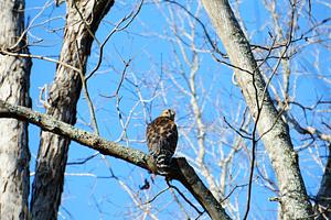 Red shouldered hawk on a perch in the tree.